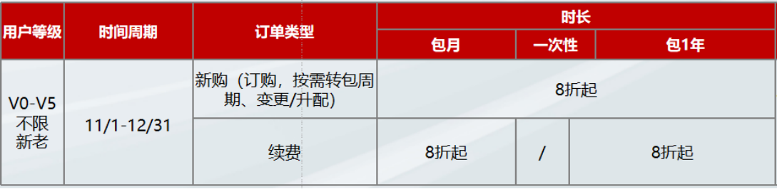 V0-V5全等级用户均可参与,覆盖多种订单类型,无需凑单直接享优惠。计算、存储、数据库、PaaS服务等主流产品均有专属折扣,适配企业不同业务模块采购需求。